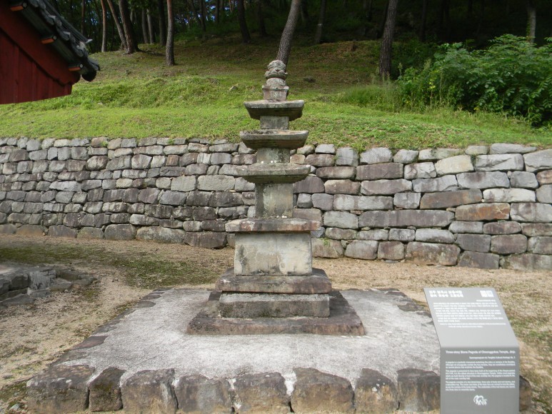 2중의 기단, 3층 탑신, 머리장식을 지닌 잘생긴 탑으로 모서리 기둥과 받침 기둥, 덮개돌을 간략히 표