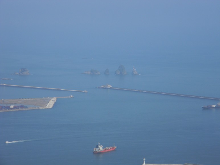 5~6개의 섬으로 이루어진 오륙도, 그 서쪽 해상에 길쭉하게 둘러진 것은 바다로부터 부산항(부산북