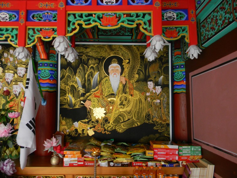 용왕탱과 석가여래후불탱, 산신탱이 나란히 봉안되어 있다. 탱화들 사이로 천하 제일의 국기인 태극