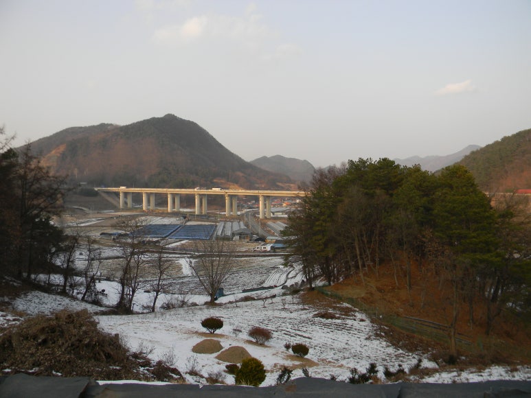 저 높이 보이는 고가도로는 당진영덕고속도로이다. 그가 있기 전에는 정말 조용했던 산촌이었는데,