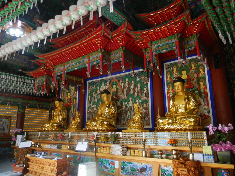 큰 덩치에 삼존상 사이로 작은 덩치를 지닌 관세음보살상과 지장보살이 자리잡고 있다.