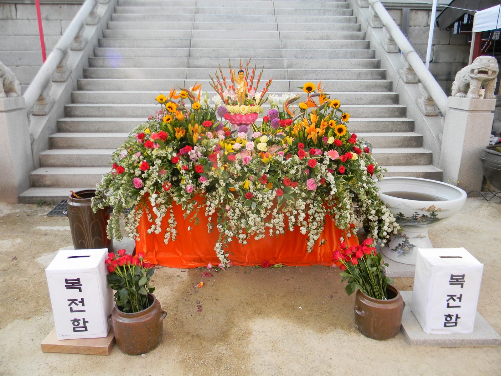 대웅전 뜨락에는 아기부처상 외에도 매우 보기가 힘든 괘불까지 왕림을 하여 나를 무척 들뜨 게 하였다. 그렇다면 괘불이 도대체 무엇이건데 나를 그렇게 기쁘게 했을까? 괘불은 조선 중기부터 등장하는 커다란 불화(佛畵)로 초파일과 절의 주요 행사일에만 잠깐씩 외출을 나온다. 그러기 때문에 왠만한 운으로도 만나기가 어려우며 그나마 만날 확률이 높은 날이 초파일이다. 내가 평소에도 많은 오래된 절을 돌아다님에도 초파일에 무조건 절 답사에 나서는 이유 중 하나도 바로 레어템<raretem, rare(희귀한)+item(물건)의 합성어>인 괘불을 보고자 함이다. 허나 초파일이라고 100% 외출을 하진 않는다. 이번 초파일에 4곳의 절집을 갔지만 겨우 개운 사에서만 괘불을 봤을 뿐이다. 확률로 따지면 1년에 정말 1번 정도 보는 꼴이다. 그러니 괘불 을 만났다면 꼭 복권을 사기 바란다. 레어템 중의 초레어템을 만났으니 말이다. (당첨은 장담 못함)