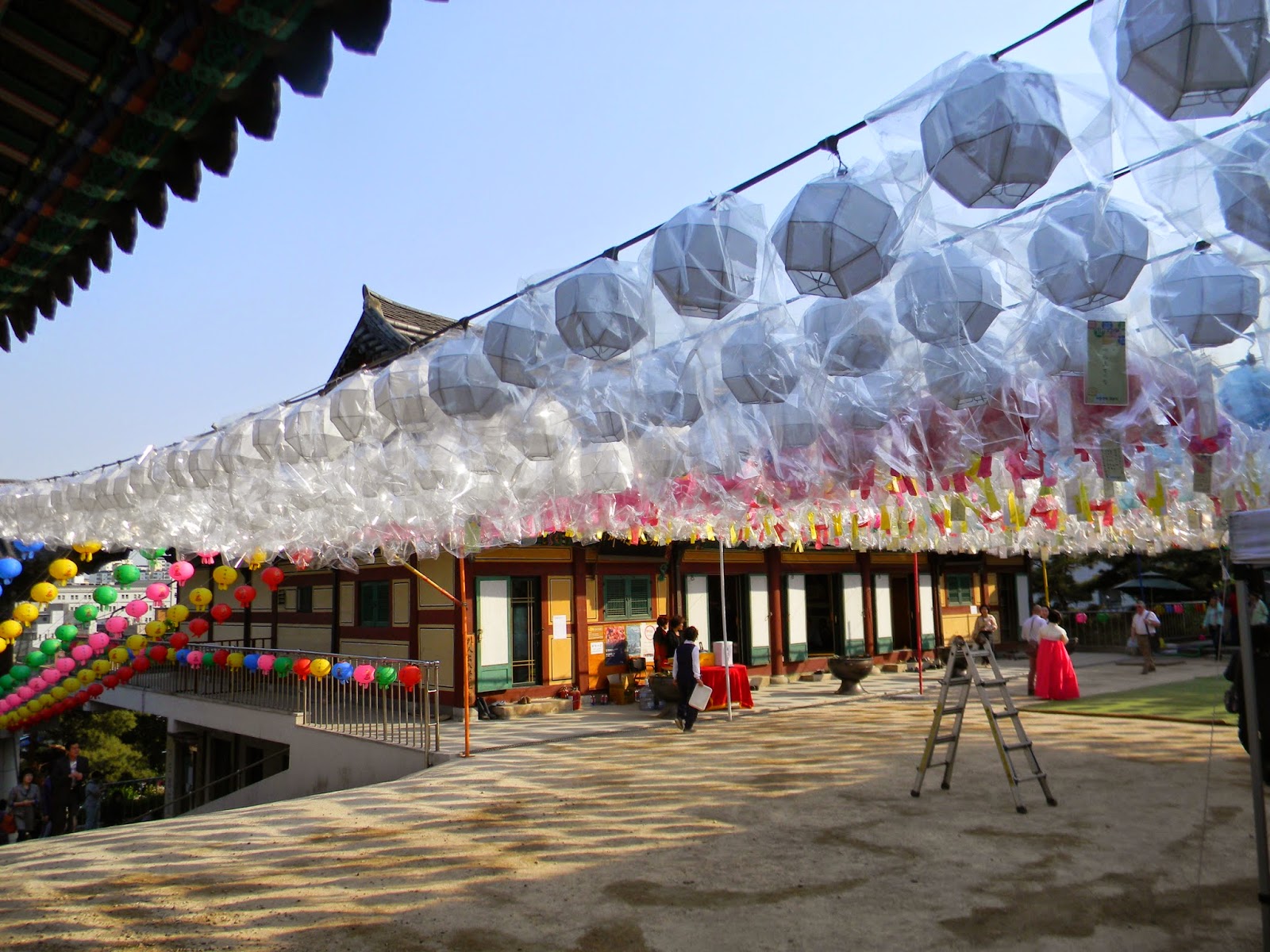 ▲ 대웅전 가운데 칸에서 굽어본 뜨락과 관불의식의 현장 개운사의 좁은 하늘을 가득 채운 연등이 저 밑에 보이니 마치 오색 구름 위에 올라선 기분이다.