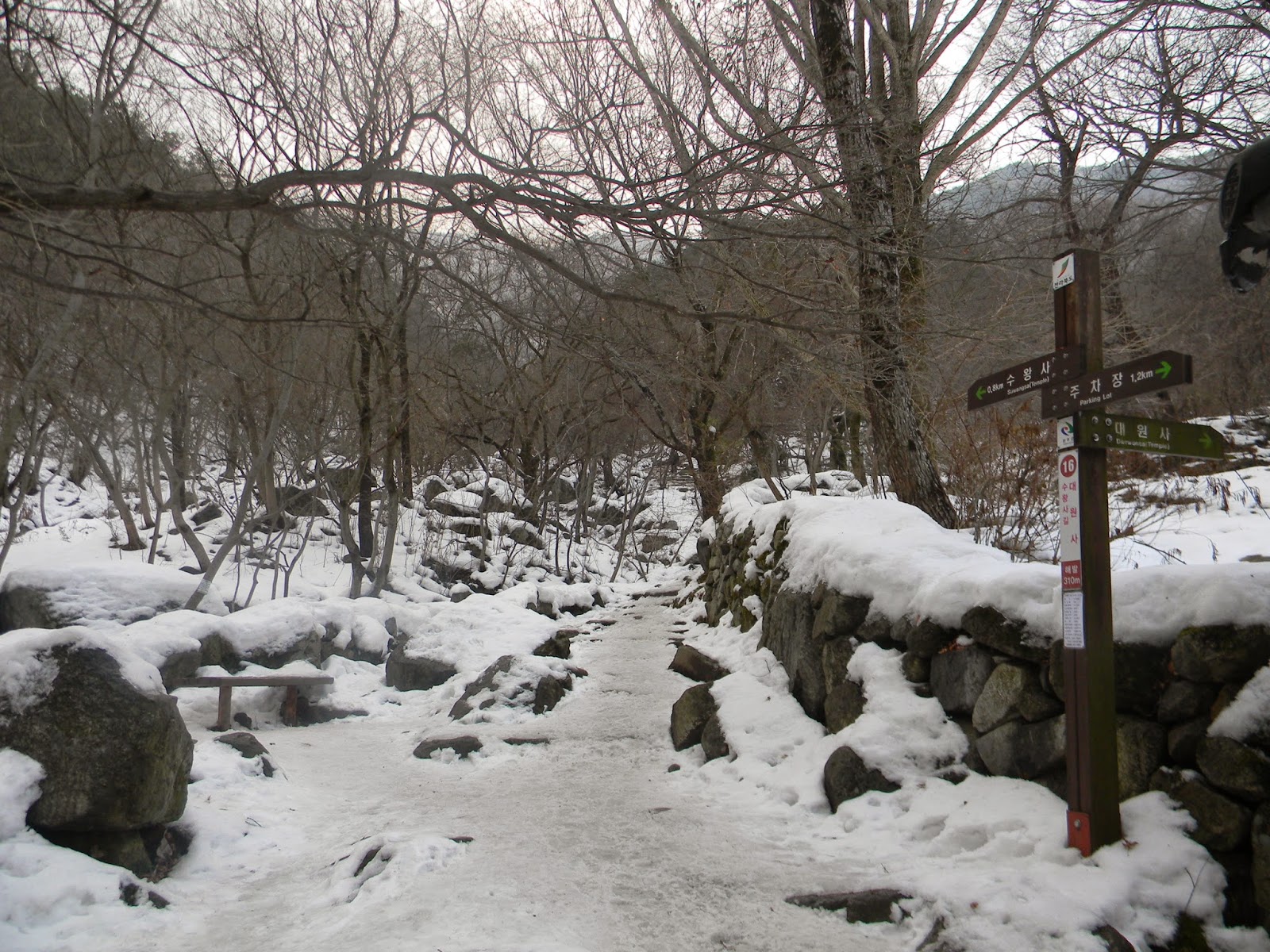 승탑을 끝으로 대원사 관람은 마무리가 되었다. 원래는 대원사만 보고 전주로 쿨하게 철수하 려고 했으나, 여기서 정상 방향으로 조금 올라가면 물맛이 일품이라는 오래된 절, 수왕사가 있다고 하여 시간도 아직 이르고 해서 거기까지 발을 넓혀보기로 했다. 기왕 모악산의 품에 들어섰으니 그 품을 더 파고들어야 아쉬움이 없겠지. 다행히 수왕사까지는 1km 남짓이다. (산 에서 1km는 평지의 1km보다 훨씬 김) 허나 문제는 산에 눈이 많이 쌓여있고 얼음 길도 적지 않다는 것이다. 거기에 대해서는 전혀 대비를 하지 않았기 때문에 걱정이 좀 되었다. 올라갈 때야 별로 문제는 안되지만 문제는 내 려올 때가 아니던가? (트래킹화를 신고 온 것이 전부임) 허나 이미 내 마음은 수왕사에 올라 가 나를 기다리고 있는 상태라 거기까지 무작정 올라가기로 했다. 내려갈 때 걱정은 나중이다.