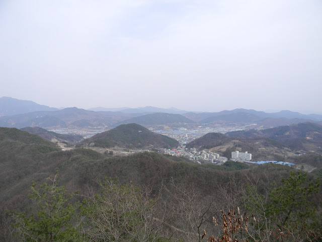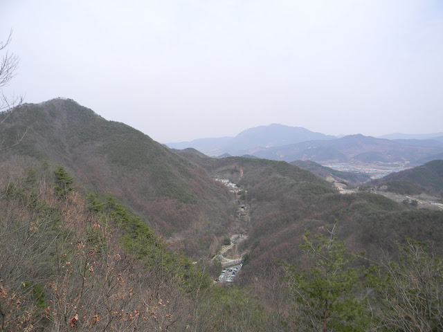정상에서 첩첩히 주름진 좁은 천하를 굽어보며 10분 가량 머물다가 동쪽 산길로 내려갔다. 여 |
