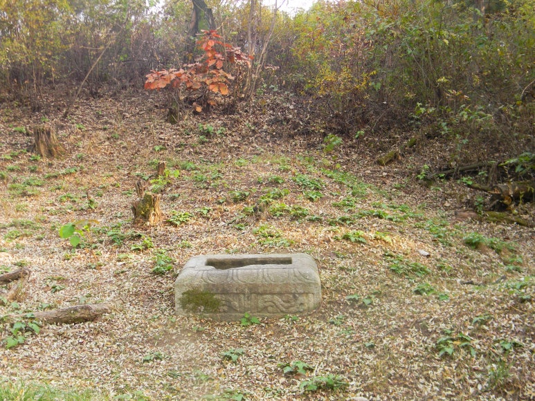 고된 세월의 때로 가득한 이 비석은 묘비(묘표)이다. 그를 지니고 있던 무덤 봉분은 바로 뒤에 있었을