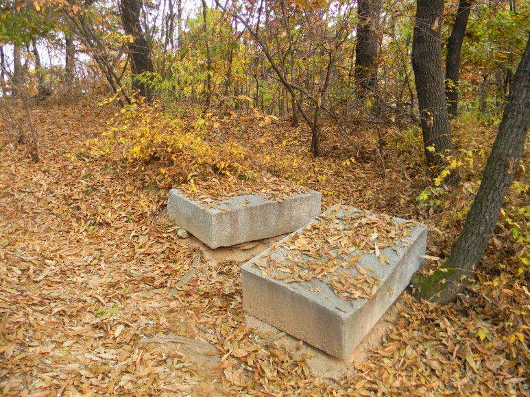 왼쪽 상석은 바로 뒤쪽(사진상으로는 왼쪽)에 무덤 봉분의 흔적이 있지만 오른쪽 상석은 부근에서 옮