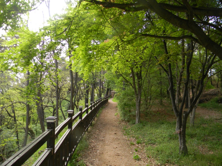 양천고성 흔적 위로 숲길이 상큼하게 입혀져 있다. 즉 이곳 산책로는 성곽 위쪽 부분으로 보면 된다.