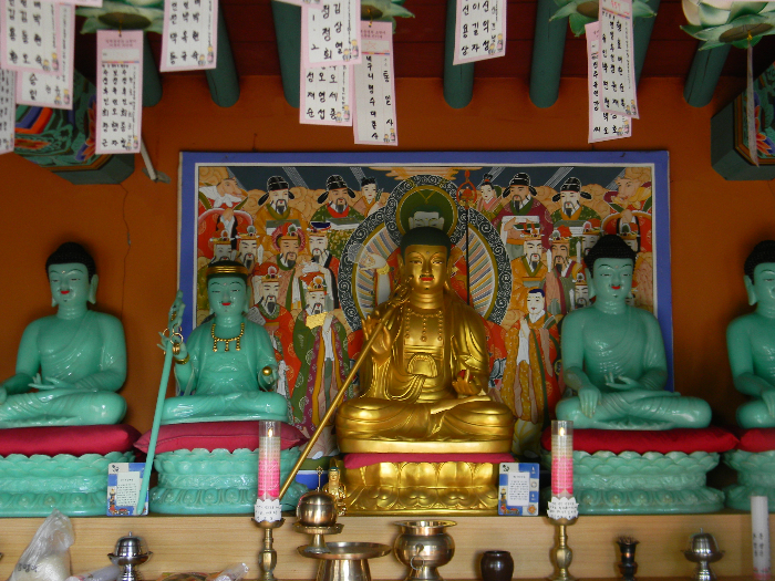 6. 통일사 지장전에 봉안된 금동지장보살상과 청동색 피부의 지장보살상, 석가여래상