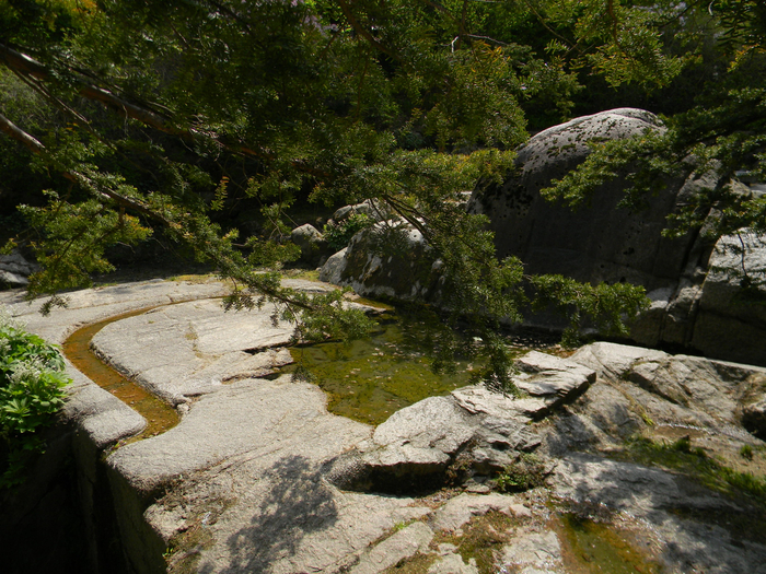 물던 물은 바로 옆 벼랑으로 떨어져 조촐하게 작은 폭포를 자아낸다. 이들 수로와 폭포는