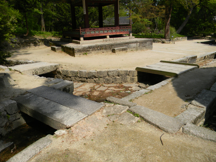 옥류천 물줄기를 가져와 저 수로를 채웠다. 수로에 물이 흐르면 돌로 다져진 수로는 그 이