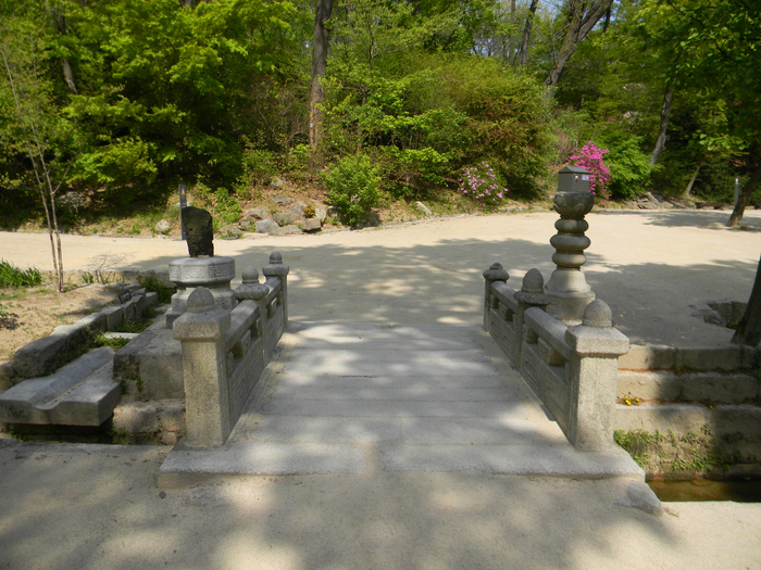 계곡 위에 작게 걸린 귀여운 돌다리 주변으로 돌기둥 3개가 자리하고 있다. 이들은 존덕정