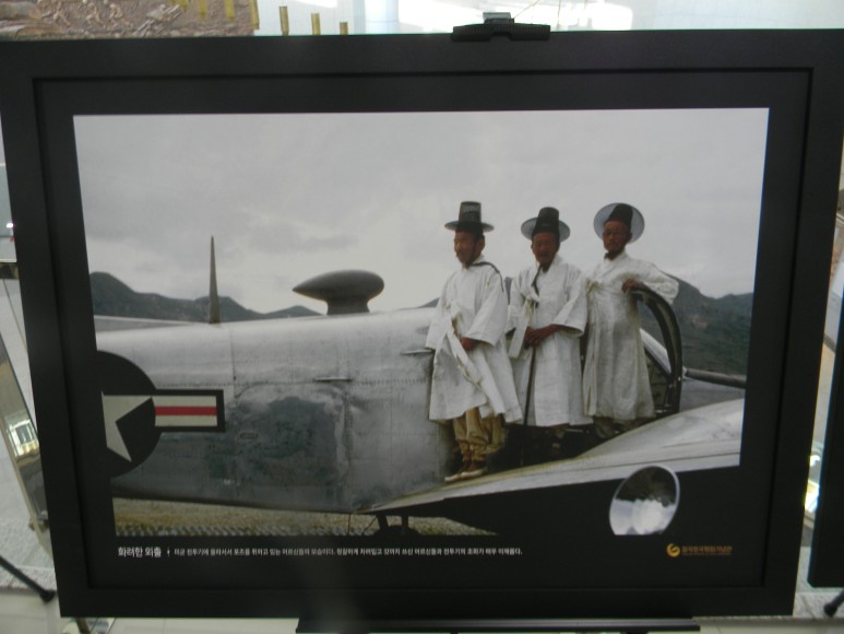 갓을 쓴 하얀 도포 복장의 노인들과 하얀 전투기의 환상적인 조화