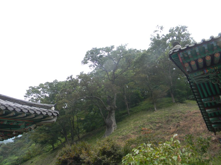 대웅전 뒷쪽의 가파른 언덕에는 늙은 느티나무가 높이 솟아나 경내에 그늘을 드리우고 있다. 그는