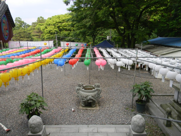석탑이 자리해 있고, 뜨락 허공에는 오색연등과 하얀연등이 가득 매달려 절 분위기를 크게 돋군다.