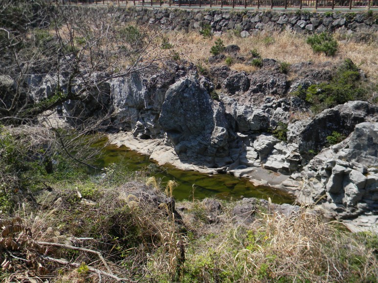 쇠소깍다리 이남부터는 효돈천 협곡이 제법 깊어지고 물줄기도 그만큼 멀어진다. 저 주름진 협곡을