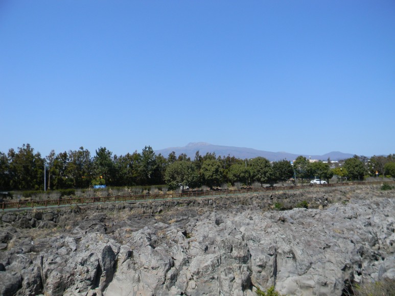 울퉁불퉁한 현무암 회색 피부의 효돈천 너머로 한라산이 흐릿하게 시야에 들어온다. 효돈천은 한라