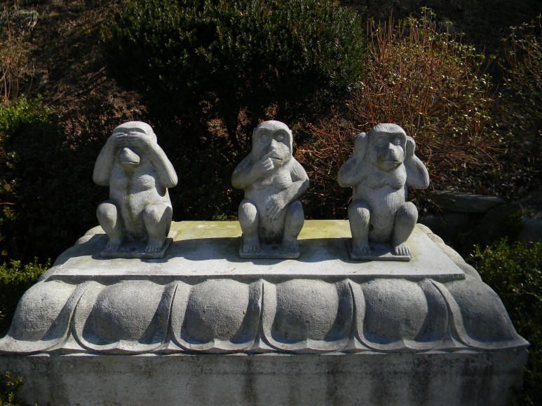 왼쪽 원숭이는 눈을 가리고 있고, 가운데 원숭이는 입을 가리고 있으며, 오른쪽 원숭이는 귀를 막았