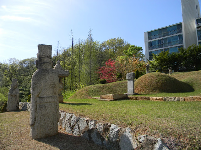 만 그 중간에 외롭게 자리해 남쪽을 바라보고 있는데, 아마도 풍수지리에 따라 그렇게 묘를