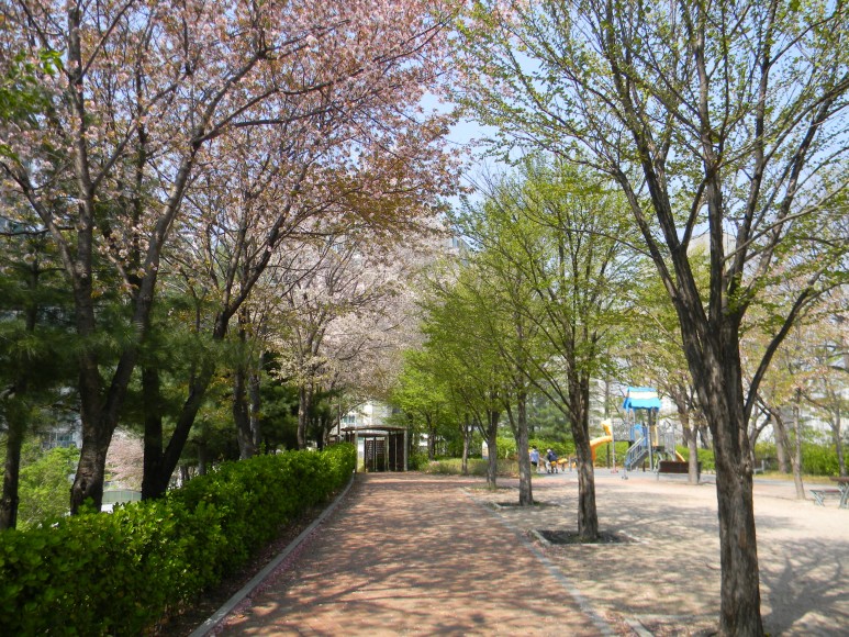 달맞이봉은 달맞이공원(달맞이근린공원)으로 살아가고 있는데, 산자락에 키 작은 나무와 개나리가