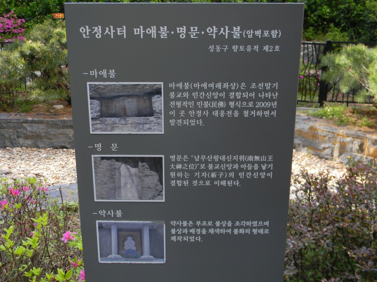 안정사터 마애불과 명문, 약사불, 그리고 그들을 머금은 바위 벼랑은 성동구 향토유적의 지위를 누