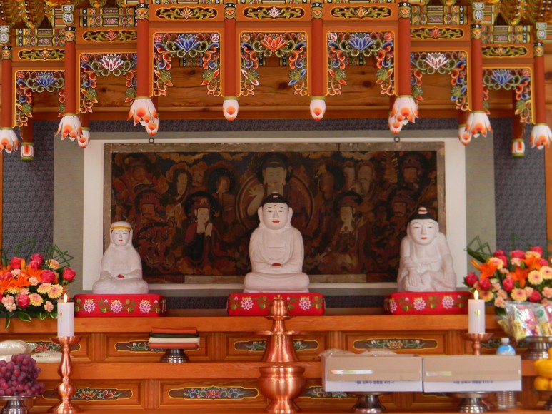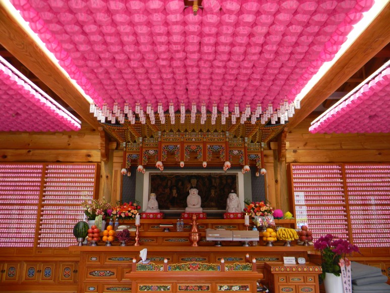 3. 연분홍 연등으로 가득한 약사전 내부 (약사여래좌상과 약사불도)