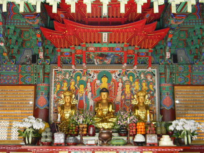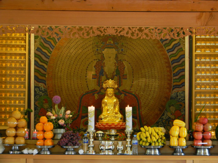 24. 청량사 대웅전 석가여래상과 뒷쪽에 걸린 후불탱