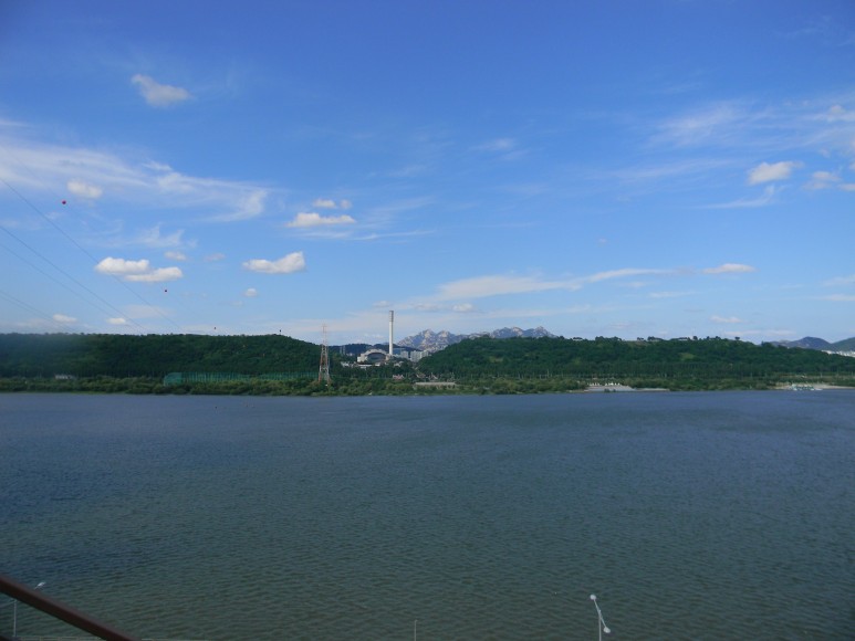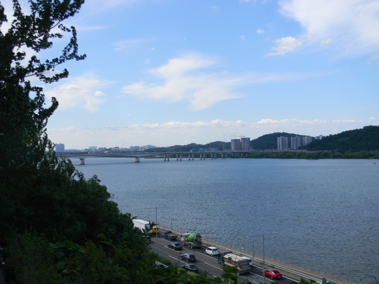 한강 너머로 두꺼운 모습의 하늘공원 산줄기가 시야에 들어온다. 지금이야 싱그러운 푸른 공간으로