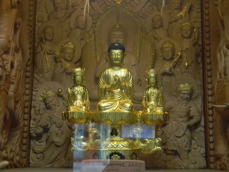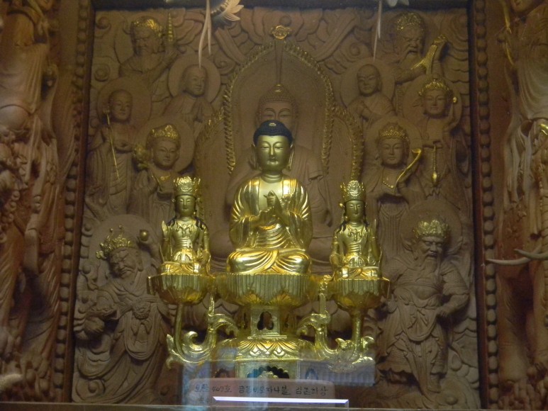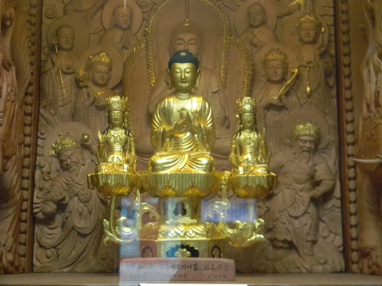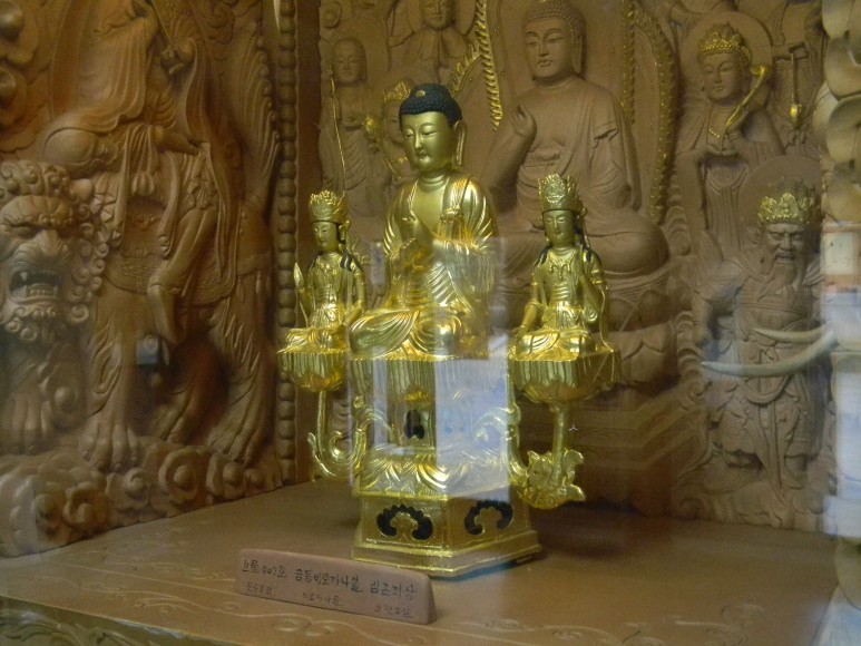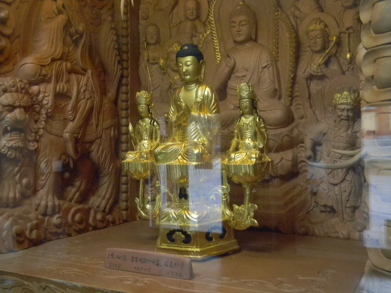 영탑사 종무소 가운데 칸에는 이곳의 1급 보물인 금동비로자나불삼존좌상이 소중히 봉안되어 있다.