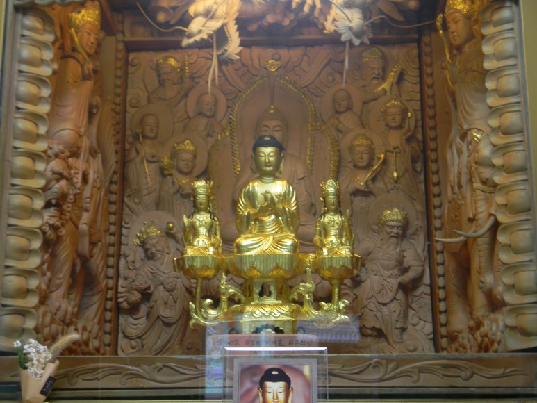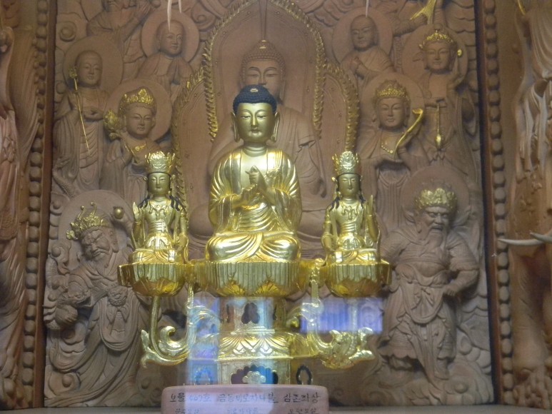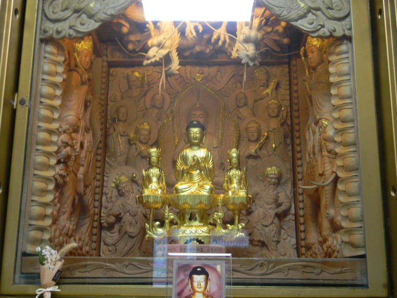 3. 옆에서 바라본 금동비로자나불삼존좌상과 목각후불탱