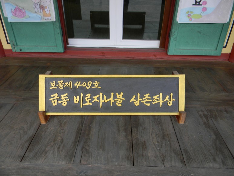 4. 금동비로자나불삼존좌상을 알리는 안내판 (종무소 툇마루)