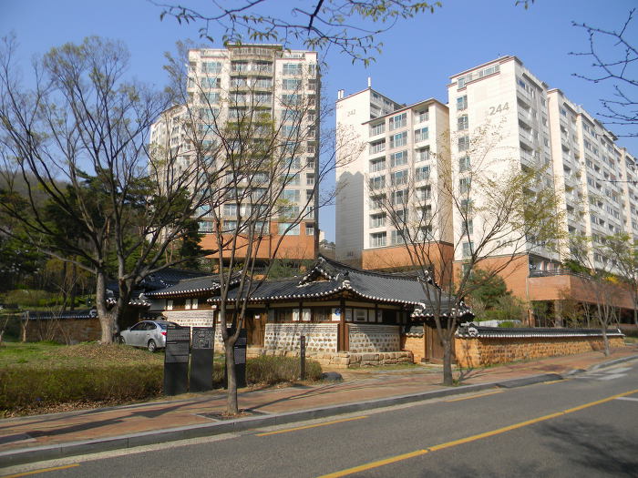 이말산 남쪽 자락이자 은평뉴타운 우물골 2단지 한복판에 기와집 일색의 금성당이 있다. 회색 |