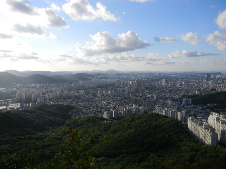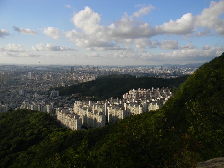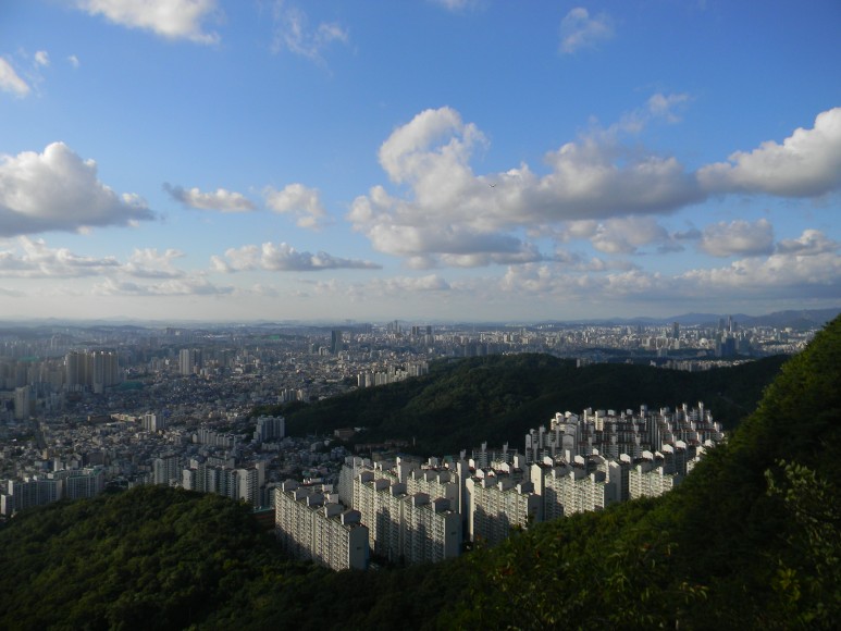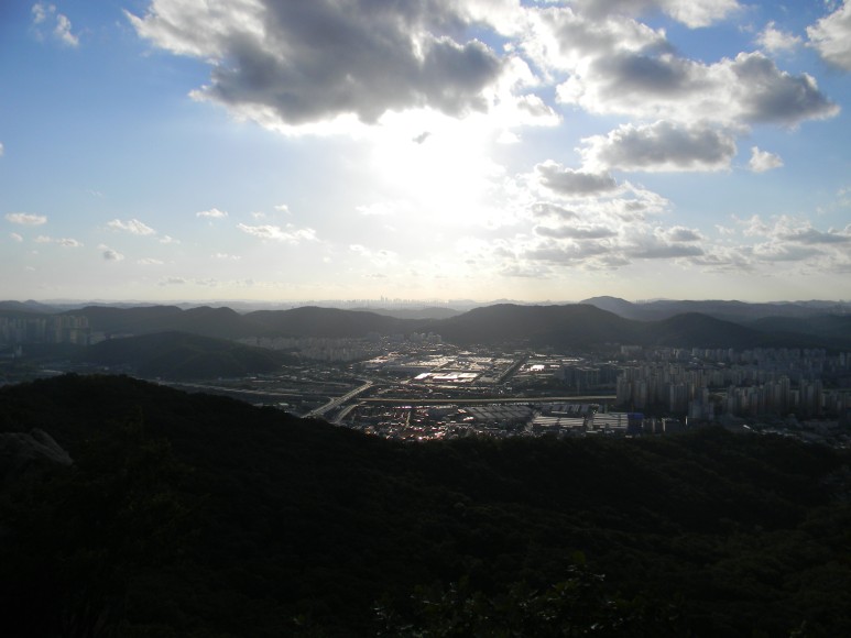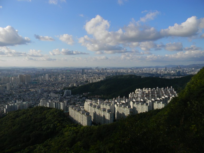 푸른 가을 하늘 아래로 호암산 남쪽 자락과 시흥동, 금천구, 구로구, 양천구, 강서구, 광명시, 부천시,
