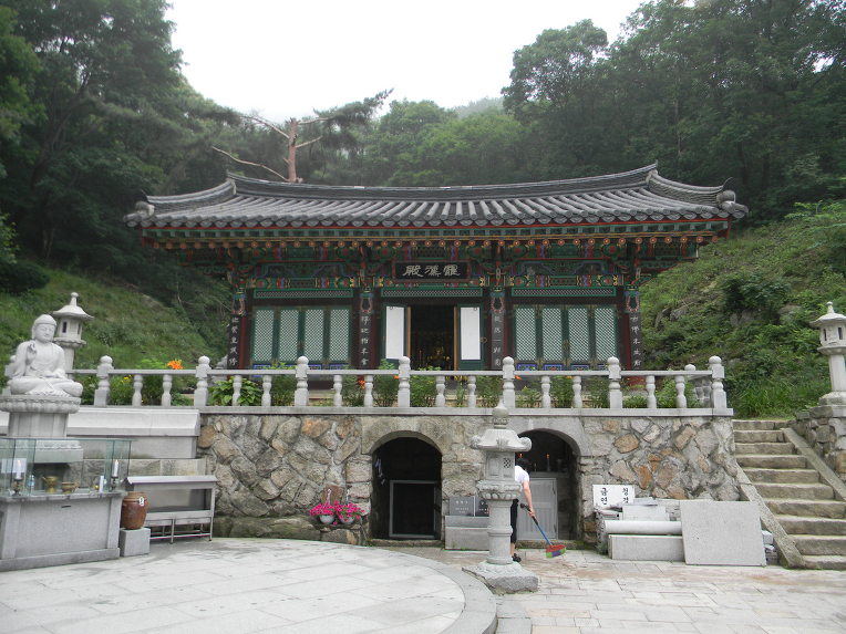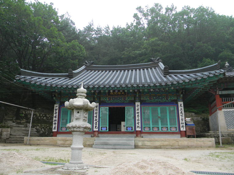 나한전 뜨락 우측에는 약사여래좌상과 석조미륵불이, 좌측에는 3층사리탑과 근래에 지어진 월 |