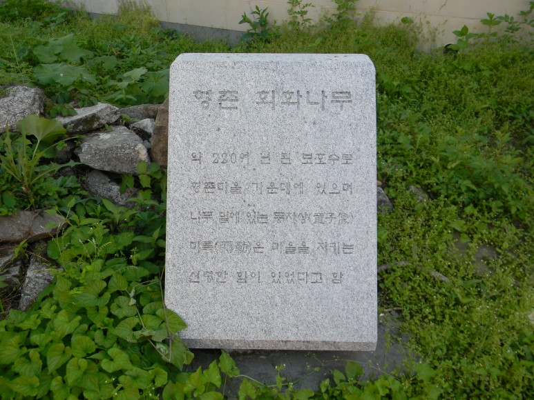 형촌 회화나무 북쪽 그늘에는 조그만 석불이 우두커니 서 있다. 이곳에서는 마을을 지키는 신령한 힘