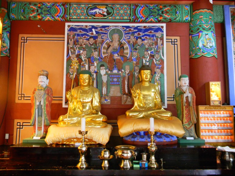 16. 극락보전 내부에 있는 금동 피부의 지장보살상과 아미타여래상, 그리고 색채감이 돋보이는 무독