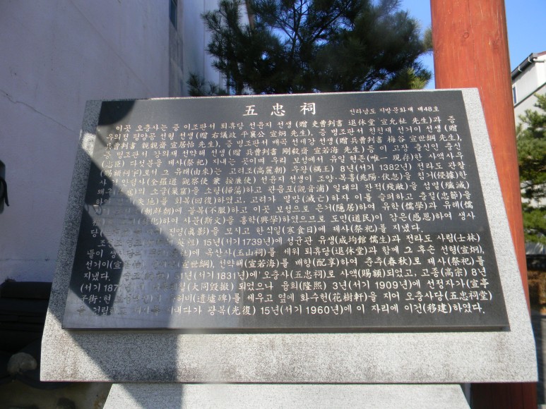 세우고 그 옆에 화수헌과 오충사당을 세워 제사를 지냈으며, 1960년 현 자리에 이건되었다.