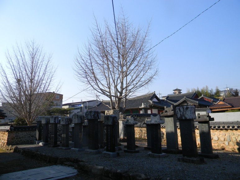 이수를 갖춘 비석과 지붕돌을 지닌 비석이 적당히 섞여 있다.
