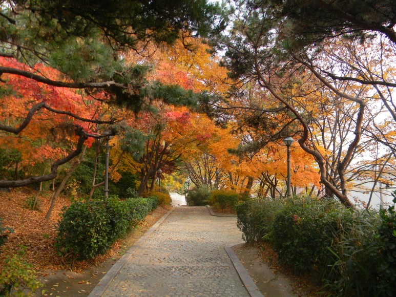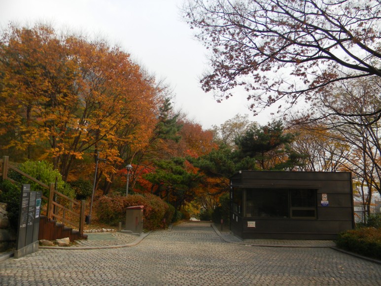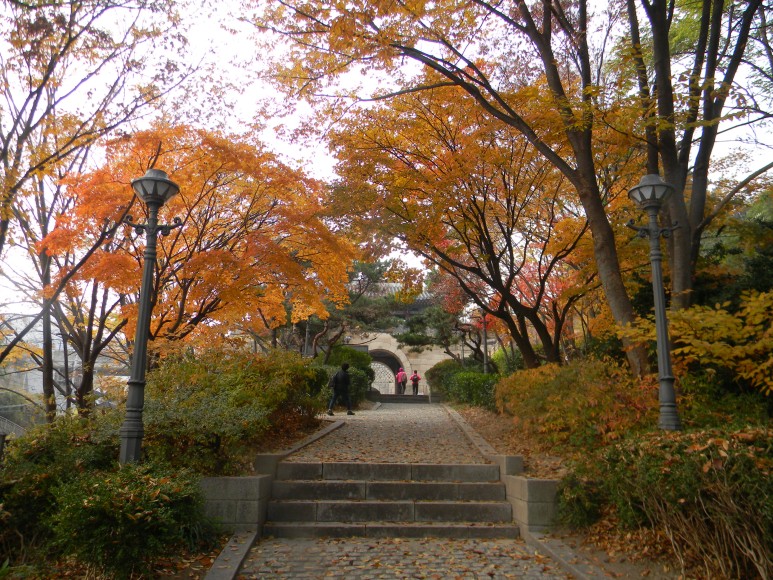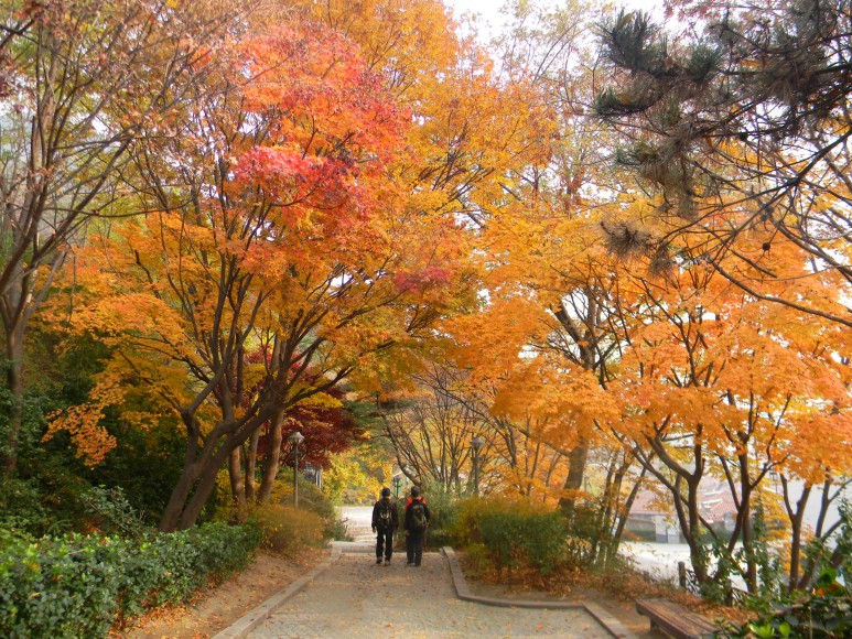 여기서 정면으로 뻗은 길은 윤동주문학관 입구로 이어지는데, 이곳의 늦가을 단풍 맛이 아주 일품이