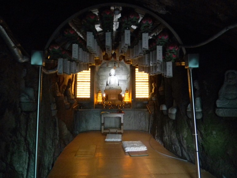어두운 석굴 내부를 인등과 촛불이 환하게 비춰주고 있다.