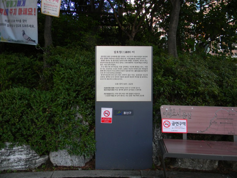 삼호정은 원래 이곳이 아닌 바로 북쪽인 용산성당 성직자묘역 아래로 여겨지는데, 인근에 있던 심원정,