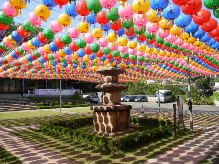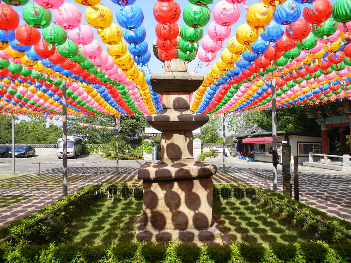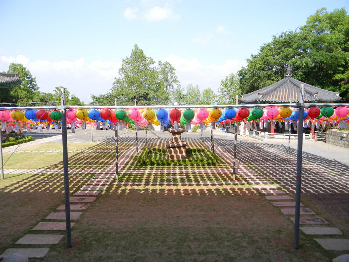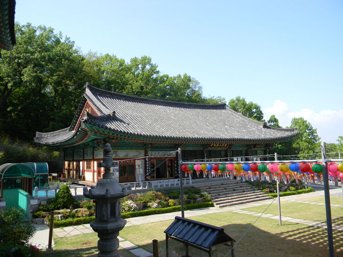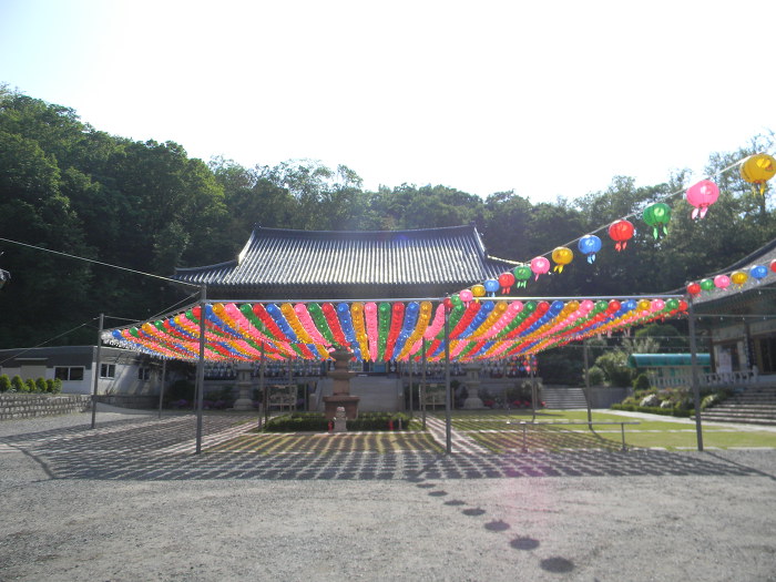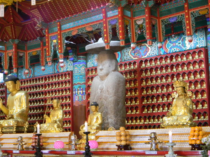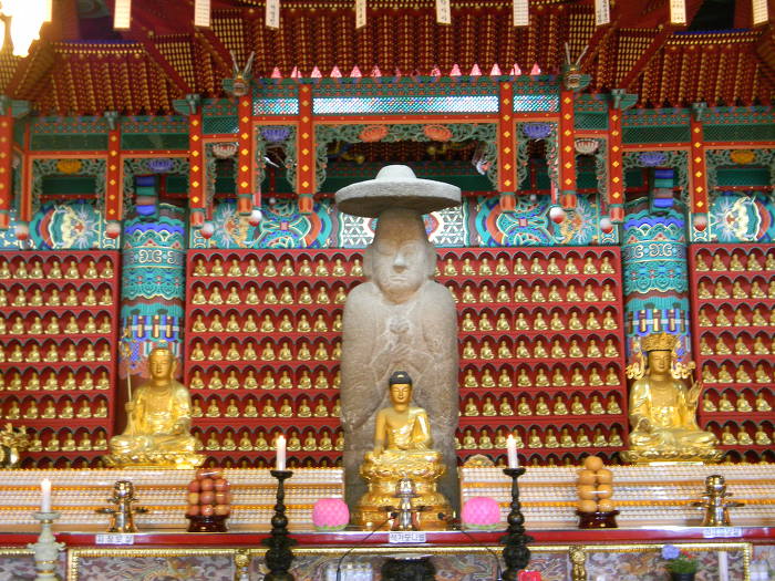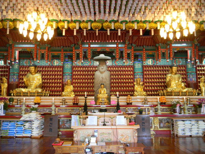 13. 대웅전의 붉은 닫집과 불단을 장식하는 여러 불상과 보살상들