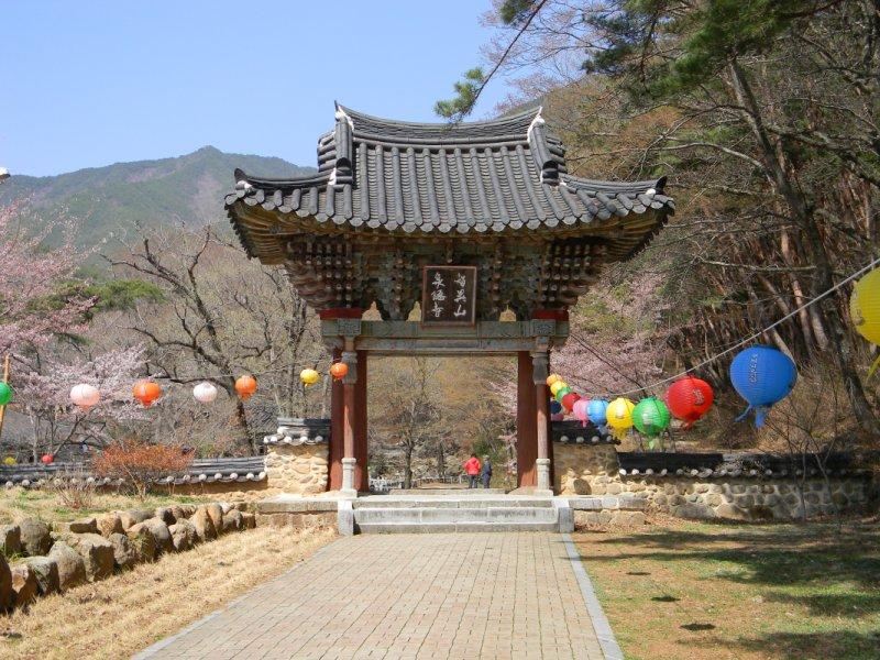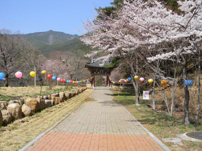 주차장을 지나면 길은 2갈래로 갈리는데 어느 길로 가든 상관은 없다. 단 왼쪽은 수레들을 위한 길이고 오른쪽은 원래의 길로 일주문으로 통한다. 기왕 절에 왔으니 속세와 불계(佛界)의 경계 이자 절의 정문인 일주문을 지나는 것이 마땅할 것이다. 일주문까지는 박석(薄石)이 깔린 길이 곧게 펼쳐져 있고 순백의 종결을 지은 벚꽃이 흐드러지게 피어나 봄의 향기를 건넨다. 알록달록 연등이 길 양쪽으로 일주문까지 이어져 그릇된 길로 빠지지 않도록 중생을 인도한다. |