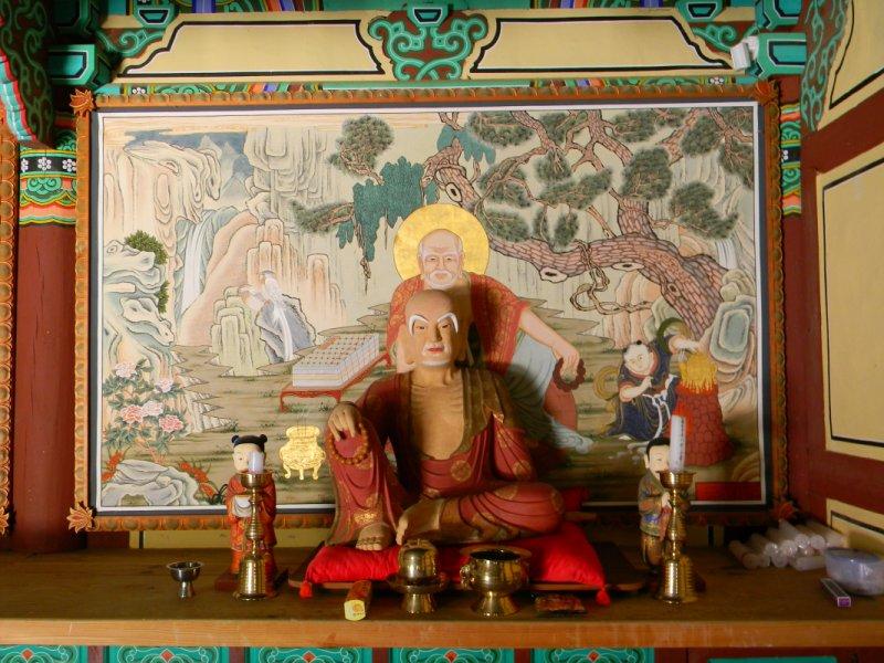 ▲ 삼성전(三聖殿) 삼성전은 우리에게 친숙한 3명의 성인, 산신(山神)과 칠성신(七星神), 독성(獨聖)의 보금자리로 보통은 전(殿)보다 1단계 아래인 각(閣)을 붙여 삼성각이라 부른다. 허나 이곳은 삼성전으로 격을 높여 다른 불전과 거의 동등한 위치로 다룬다. 우리나라의 수많은 절에 발자국을 남겼지만 삼성전은 이곳이 처음이다. |