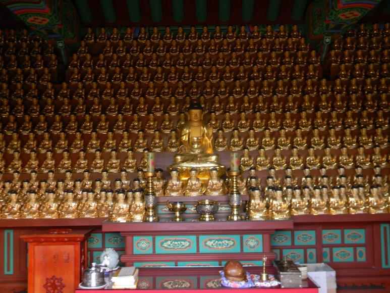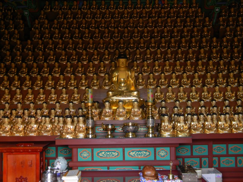 표정이 후덕한 목조약사여래좌상이 천불에 가까운 작은 금동 원불을 거느리며 나란히 단체 촬영에